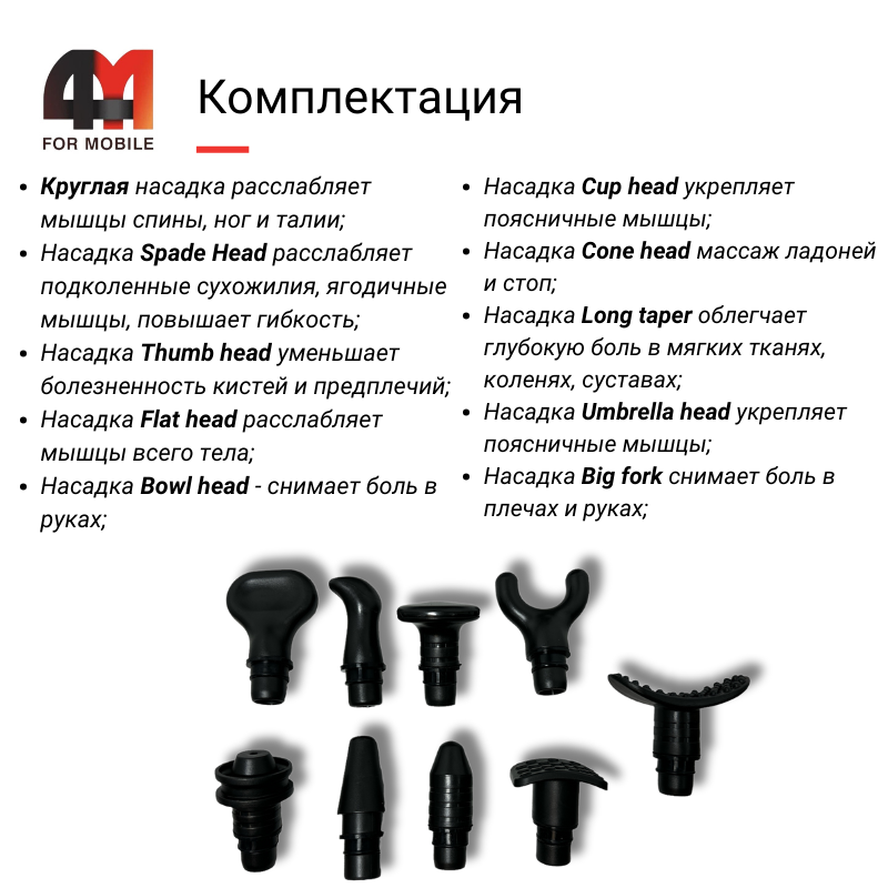 Поставляется вместе с 10 различными насадками, такими как Round head, spade head, flat head, bowl head, cone head, long taper, thumb head, umbrella head, big fork, cup head, что позволяет вам настроить массаж под ваши потребности. Комплектация включает в себя сумку для переноски, зарядный кабель, англоязычную инструкцию и, конечно же, сам массажер TAKRINK.