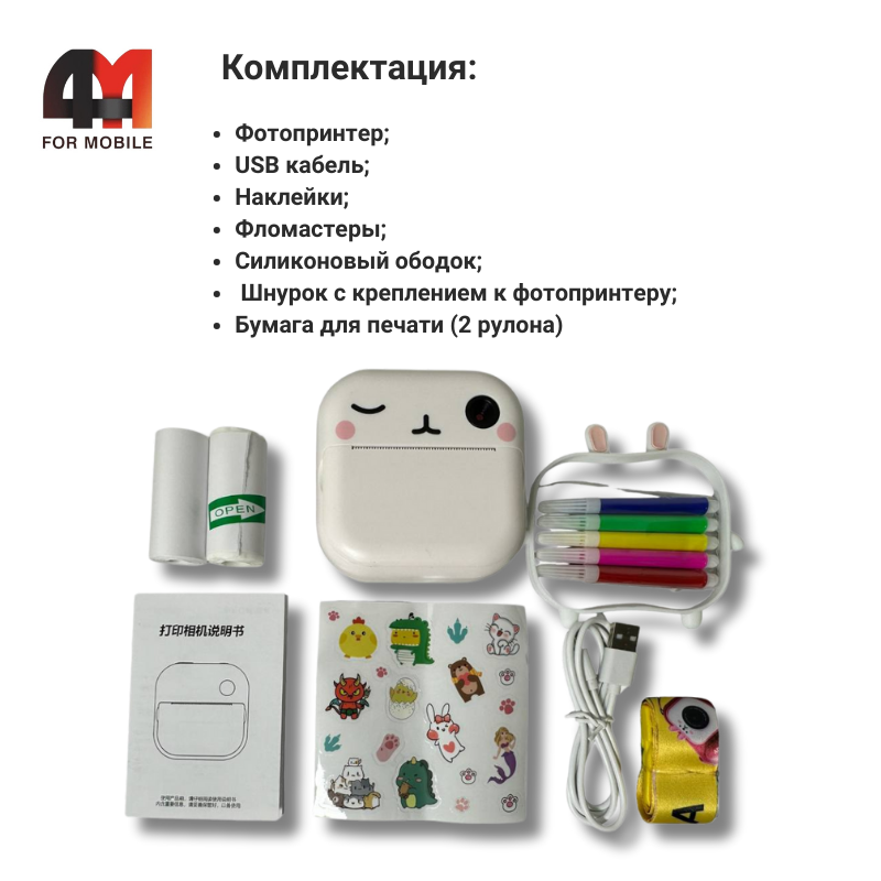Комплектация: Фотопринтер, USB кабель, Наклейки, Фломастеры, Силиконовый ободок, Шнурок с креплением к фотопринтеру, бумага для печати (2 рулона).
