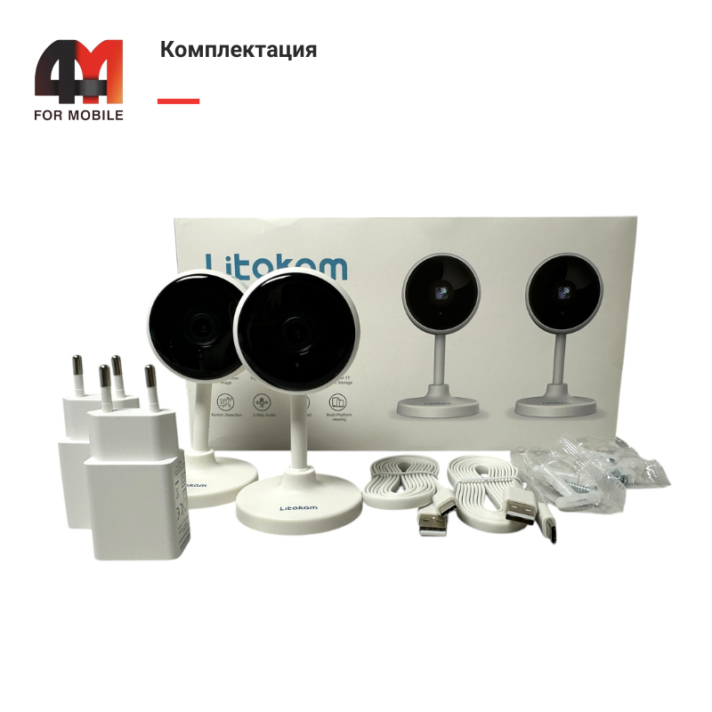 Комплектация: 2 х камера, 2 х кабель для зарядки Type-c, 2 х сетевых адаптера 2 х 3М двусторонние наклейки, 2 х набор винтовых кронштейнов, руководство пользователя.
