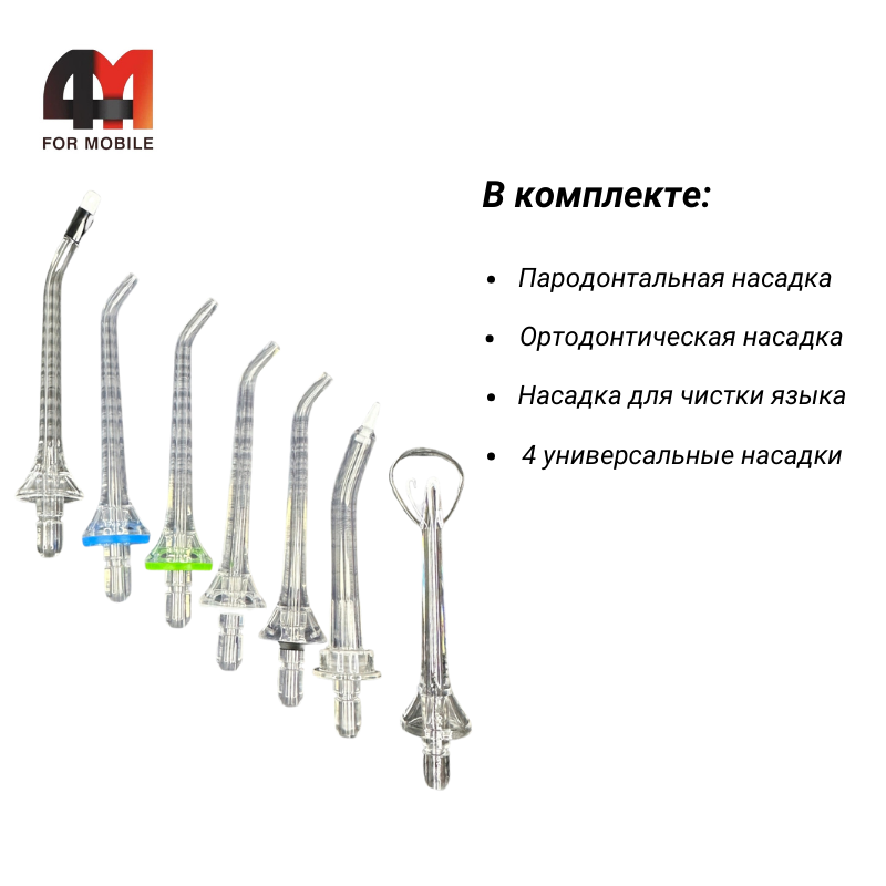 Насадки: Пародонтальная, ортодонтическая и насадка для чистки языка, а также 4 универсальные насадки;