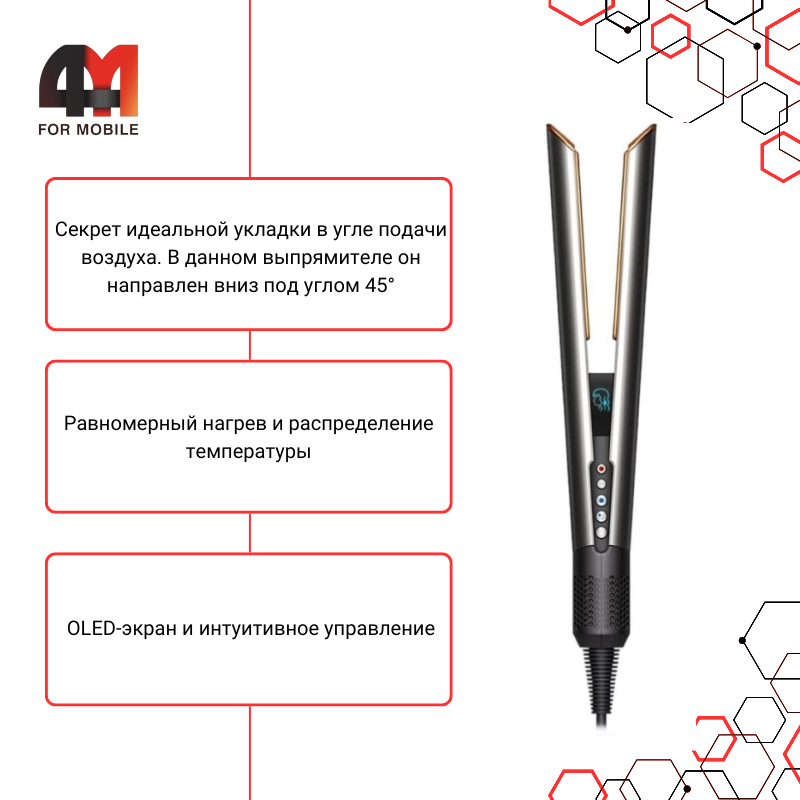 Минималистичный OLED-дисплей показывает текущий режим: влажная или сухая укладка, уровень нагрева, скорость воздуха. Никаких догадок - всё видно и понятно.