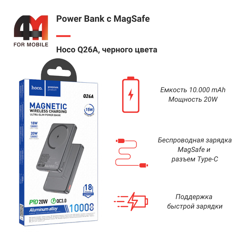 Hoco Q26A 10000 mAh - компактный внешний аккумулятор с магнитным креплением и беспроводной зарядкой до 15 Вт. Он фиксируется на спинке совместимого смартфона и заряжает его без кабеля, а при необходимости работает и как классический power bank по USB-C с поддержкой быстрой зарядки PD 20W. Ультратонкий корпус, черный цвет и продуманные режимы делают Q26A удобным вариантом для города, поездок и работы в дороге.