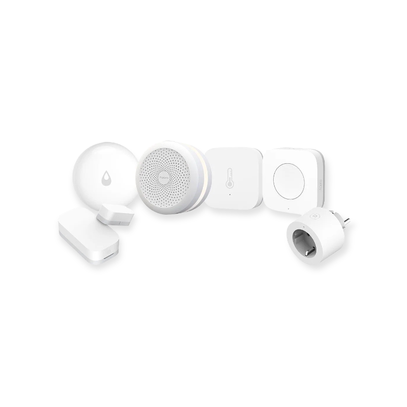 В комплекте: датчик протечки, центр управления, датчик открытия, умная розетка, датчик температуры и влажности, беспроводная кнопка;